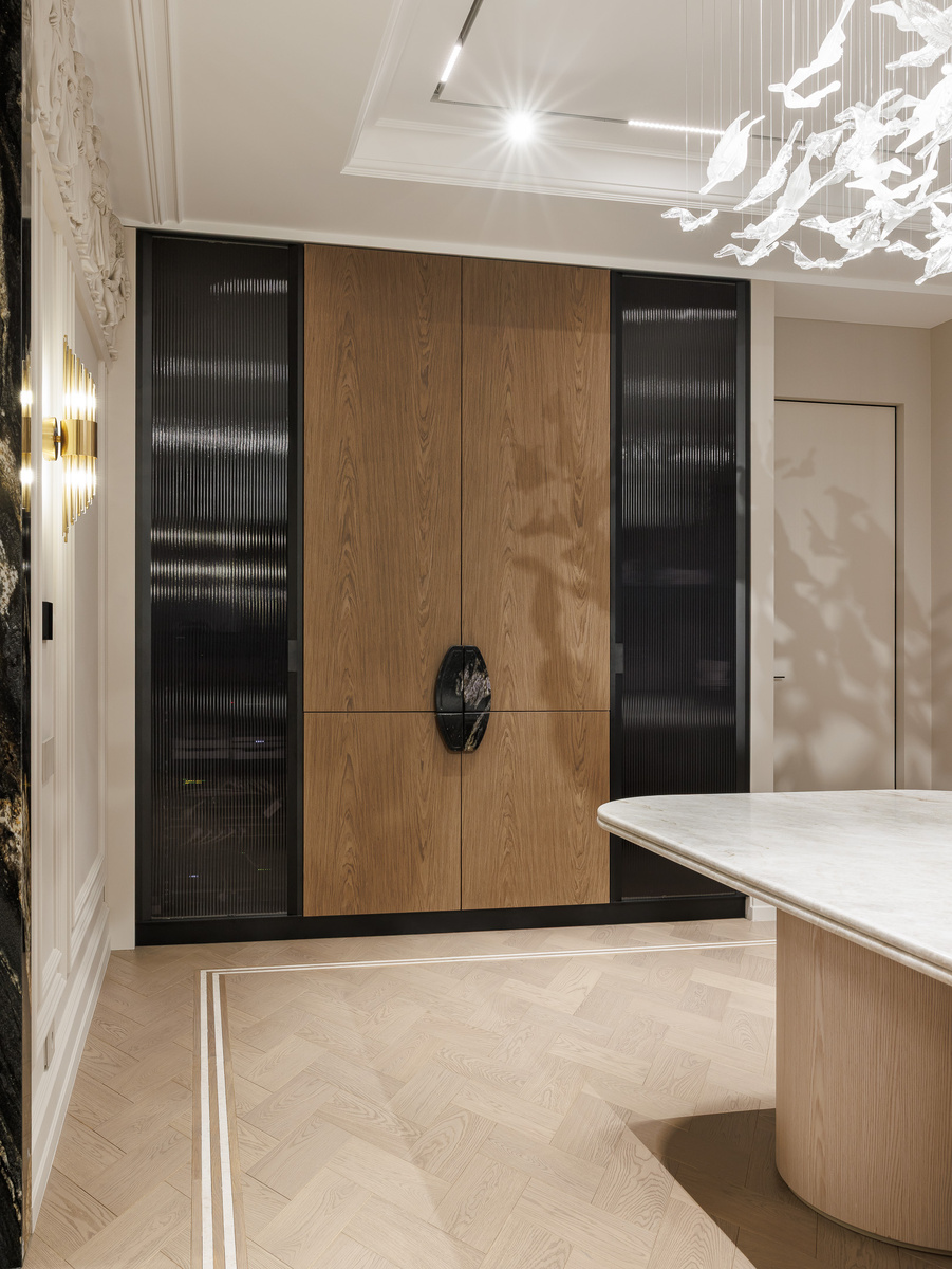 Недалеко от кухни расположена столовая — это отдельное помещение, в которое можно попасть через широкий дверной портал. Здесь обращает на себя внимание встроенный барный шкаф созданный нами. Фасады выполнены в натуральном шпоне, поддерживая общую отделку интерьера. По бокам мы предусмотрели витрины с рифлёным стеклом — в них удобно размещать предметы повседневного использования, не выстраивая идеальную композицию: непрозрачное стекло мягко скрывает содержимое и делает его менее заметным. Отдельный акцент — ручка. Она выполнена из натурального камня и разделена на четыре части, каждая из которых относится к своему фасаду. При этом в закрытом состоянии они собираются в единый цельный элемент, усиливая ощущение продуманной и цельной конструкции. Фото: Иван Сорокин