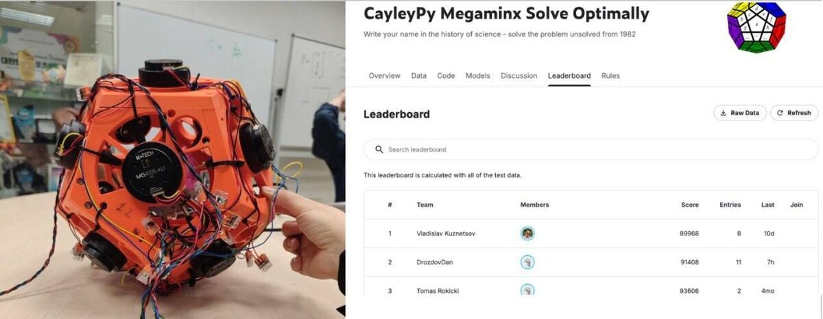 🚀 Серия соревнований по МЛ и научный проект ! Денежный призовой фонд больше 150 000 р и будет расти ! Кому интересен МЛ/RL или математика или пазлы или роботы. Приглашаем Вас принять участие в серии челленджей и развитии научного опен-соурс проекта. Соревнование организуется совместно с учеными лаборатории интеллектуальных технологий робототехники МФТИ, (руководит проектом - Илья Осокин), которые поставили себе амбициозную цель создать робота, который побьет мировой рекорд по сборке Мегаминкса ! Проект CayleyPy предлагает Вам принять участие в решении алгоритмической части задачи - создании алгоритмов - которые смогут получать наиболее короткие (близкие к оптимальным ) решения. Методы решения важны в широком круге проблем от математики до квантовых компьютеров, МЛ/РЛ и теории струн. Для этого мы организовали соревнования на платформе Каггл. Подробная информация: https://t.me/sberlogabig/643