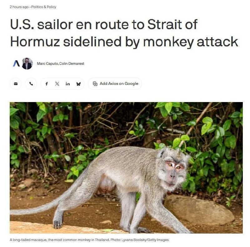 Электронный техник ВМС США на корабле по борьбе с минной угрозой, направлявшийся в Ормузский пролив, получил серьезные травмы от обезьяны после остановки в Таиланде. Присоединяйтесь к нашему каналу «За Русский Мир» в МАХ 🌐 За Русский Мир©Резервный📣Наш Чат✔️Подпишись‼️