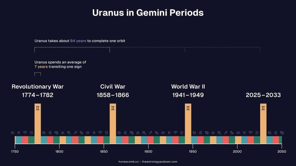 В дополнение к видео и для тех, кого тоже напрягают гуляющие по интернету картинки «Уран в Близнецах — это война». Картинка выглядит убедительно, но, как говорится, есть нюанс. Любая война — это не причина. Это финальная стадия процесса, который складывается из множества факторов: экономика, ресурсы, союзы, управление, технологии. Всё это не возникает в один момент. Годами накапливается цепочка событий в мировых отношениях, которая в какой-то момент приводит к резким действиям противоборствующих сторон. И да, на Уране в Близнецах часто усиливается военная активность. Но войны происходят и в другое время. В мире в принципе всегда кто-то с кем-то воюет. Поэтому связывать это только с Ураном — слишком упрощённая логика. Уран в Близнецах — это не кровожадная планета, его задача не разрушать ради разрушения, а перераспределять связи, делать новые открытия, развивать интеллектуальное пространство человечества. Период 1774–1782 — поздняя эпоха Просвещения. В это время меняется роль информаци