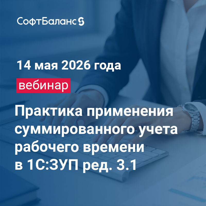 Группа компаний "СофтБаланс" приглашает на бесплатный практический вебинар "Практика применения суммированного учета рабочего времени в 1С:Зарплата и управление персоналом ред. 3.1". На вебинаре вы научитесь: В программе вебинара будут теоретические и практические примеры, а также практические рекомендации по минимизации рисков, связанных с суммированным учётом. Вебинар будет полезен как специалистам коммерческих компаний, так и сотрудникам государственных учреждений, ведущих учет в 1С:ЗКГУ. 14 мая 2026 года (четверг) с 11:00 до 14:00, онлайн Регистрация по ссылке Спикер: Ольга Беляева – специалист-консультант 1С с опытом более 20 лет, преподаватель, практикующий бухгалтер Кому будет полезно: руководителям подразделений, специалистам по управлению персоналом, кадровым специалистам, бухгалтерам по расчету заработной платы. Дата и время проведения: 14 мая 2026 года (четверг) с 11:00 до 14:00 Формат: онлайн-трансляция Ознакомиться с подробной программой и зарегистрироваться на вебинар мож
