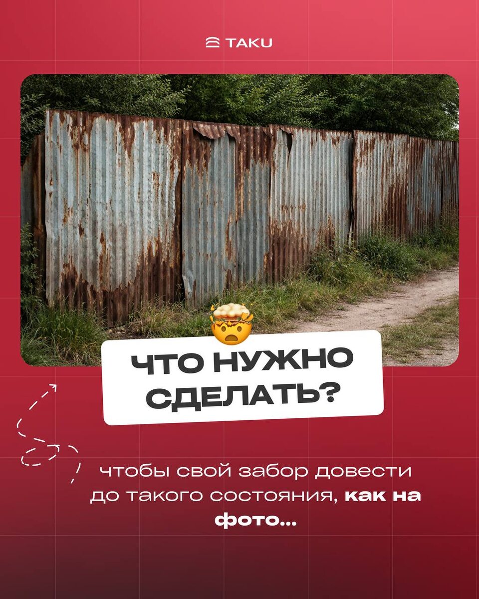 первых этапах… ❗️ Так что нужно сделать (или наоборот — проигнорировать), чтобы довести забор до такого состояния, как на фото: 1️⃣Экономия на покрытии Выбор материала с минимальной защитой — одно из самых уязвимых решений. Листы без полноценного цинкового слоя или с его недостаточной толщиной теряют устойчивость к внешней среде уже в первые сезоны эксплуатации. 2️⃣Отсутствие ухода Даже качественно установленный забор требует периодического внимания. Осмотр конструкции, устранение мелких повреждений, очистка от загрязнений — простые действия, которые существенно замедляют износ. 3️⃣Ошибки монтажа Нарушение технологии установки приводит к образованию зазоров, перекосов и зон скопления влаги. В таких условиях даже хороший материал начинает терять свои свойства значительно быстрее. 4️⃣Игнорирование условий эксплуатации Влажность, перепады температур и окружающая среда напрямую влияют на долговечность металла. И если выбранный материал не соответствует этим условиям, процесс коррозии