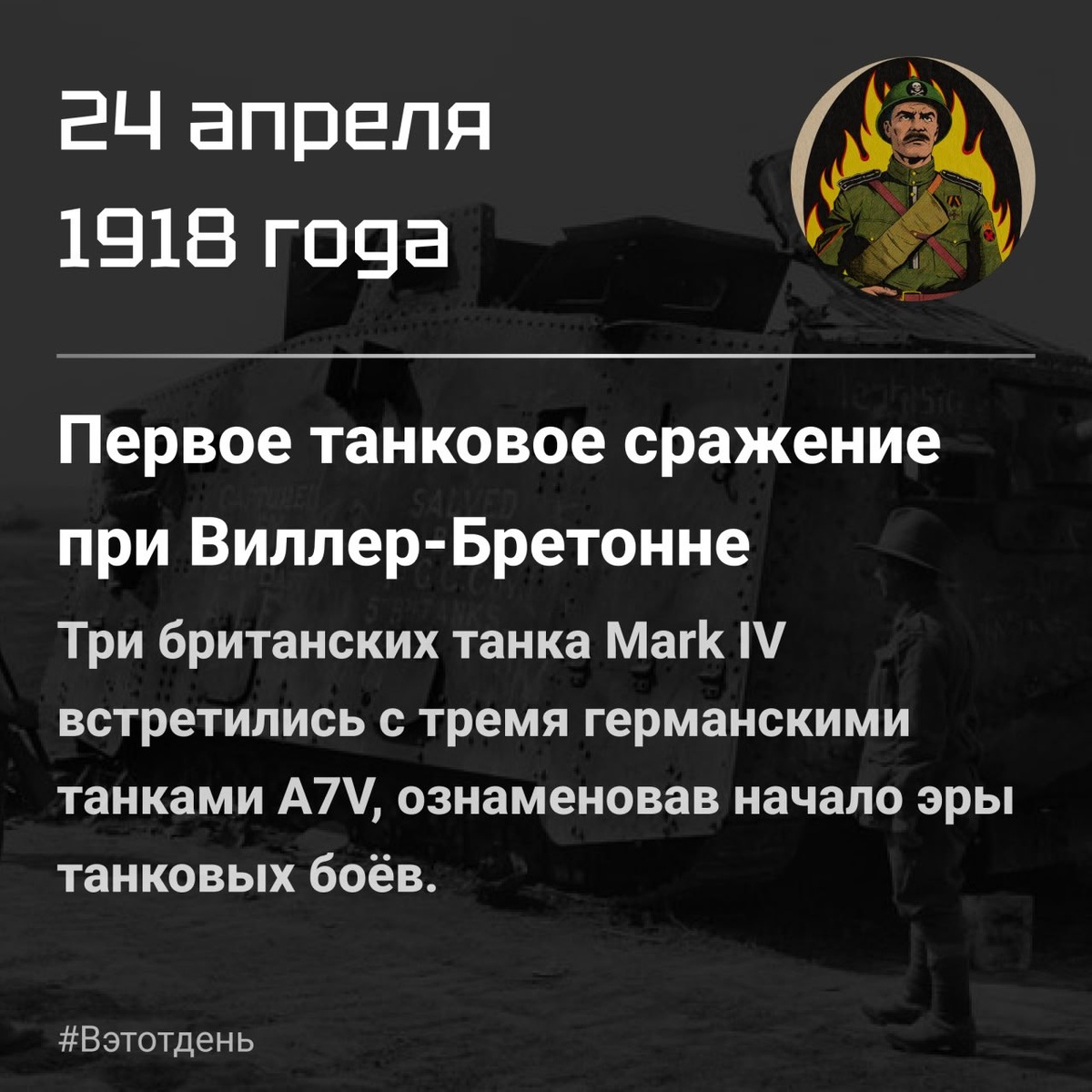 24 апреля 1918 года в ходе второй битвы при Виллер-Бретонне во Франции произошло первое в истории танковое сражение