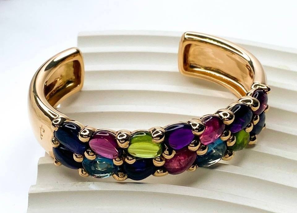 Основа выполнена из розового золота 750 пробы теплого оттенка. Два ряда овальных камней создают яркую палитру из цветов: синие сапфиры соседствуют с фиолетовыми аметистами, розовые родолиты переливаются рядом с зелеными хризолитами, а голубые топазы добавляют свежести всей композиции. Каждый камень надежно закреплен. Браслет незамкнутый, что обеспечивает удобство при надевании. Несмотря на внушительный вес, украшение удобно сидит на запястье благодаря эргономичной форме.
