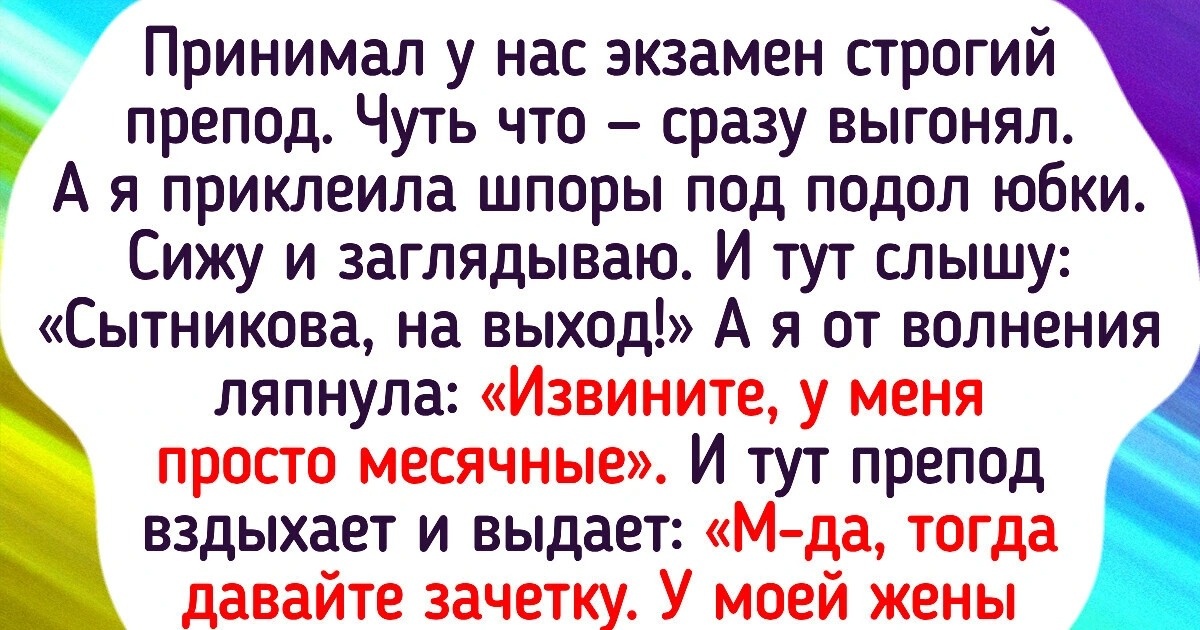 Принимал у нас экзамен строгий препод. Чуть что — сразу выгонял. А я приклеила шпоры под подол юбки. Сижу и заглядываю. И тут слышу: «Сытникова, на выход!» А я от волнения ляпнула: «Извините, у меня просто месячные». И тут препод вздыхает и выдает: «М-да, тогда давайте зачетку. У моей жены в такие дни раньше вообще голова не работала». Такого поворота событий я не ожидала и поспешила с зачеткой к нему, а потом уже на выход.