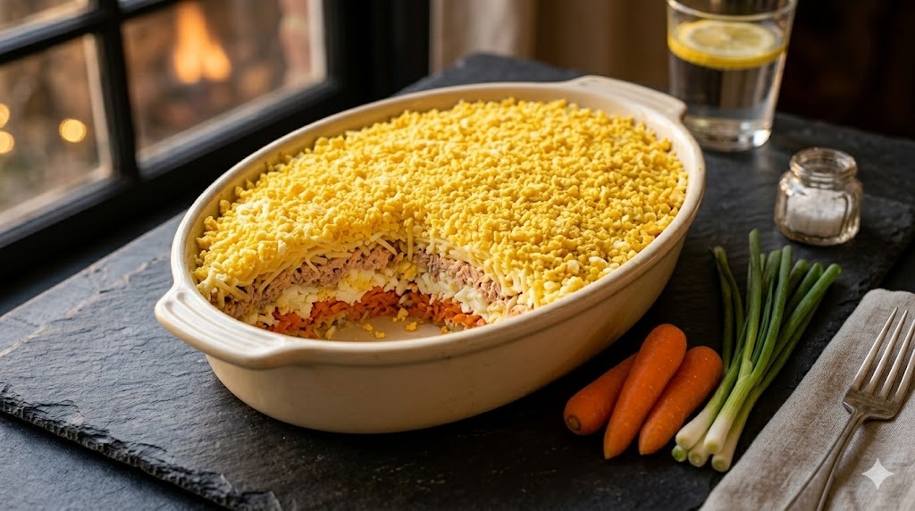 Мимоза с горбушей это тот же слоёный салат, который все знают. Слои те же, порядок тот же, логика сборки та же. Только рыба другая, и именно она меняет общее впечатление. Горбуша не перебивает, не резкая, не жирная. Салат получается нежным и вполне праздничным при минимальных затратах. Все ингредиенты найдёте в любом ближайшем супермаркете.