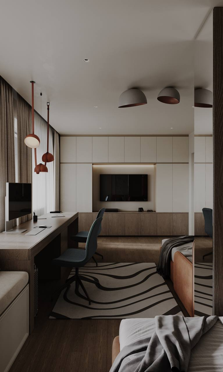 Баланс — между общим пространством и личной территорией, между игрой и отдыхом, между сегодняшними потребностями и тем, что будет актуально через несколько лет. В этом проекте интерьер выстроен так, чтобы у каждого ребёнка было своё место. Спальная зона, хранение, рабочий стол — всё продумано и распределено заранее, без конкуренции за пространство. Кровати разделены лёгкой перегородкой — она не перегружает комнату, но даёт ощущение приватности. Настроение интерьера — тёплое и спокойное: мягкие оттенки, древесная фактура, аккуратные акценты. Детали добавляют глубину, но не перегружают пространство. Эта детская спроектирована на вырост: гибкую нейтральную базу можно адаптировать под меняющиеся вкусы и возраст. Больше о нас и наших проектах: https://arhidom-buro.ru/