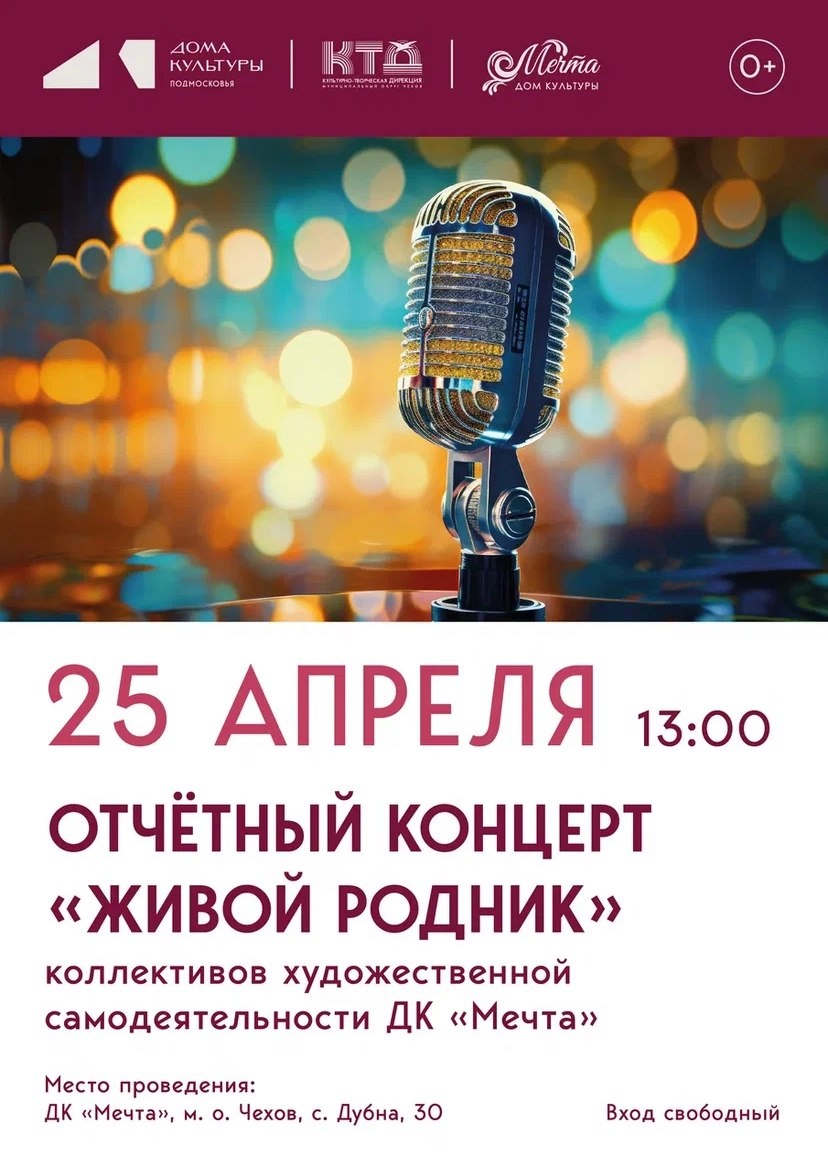 ✨ Отчетный концерт творческих коллективов ДК «Мечта» 🔥Вас ждут яркие выступления артистов, танцы, песни и номера различных жанров. 📆 25.04.2026 🕛 13:00 🏢 ДК «Мечта» 📍 г.о. Чехов, с. Дубна, д.30 🪙 Вход свободный❗️ ⭐Поддержать канал голосом ✅ Мероприятия Чехов https://dzen.ru/id/66cc4b48e9ef144699238a51 https://vk.ru/chekhov_events http://dzen.ru/chekhov_events
