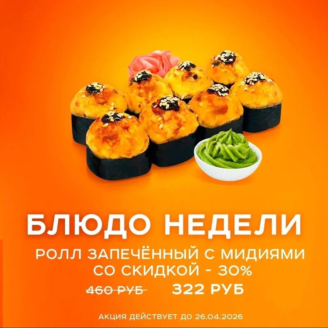 🥘 Погода обещает на неделе дожди, а мы обещаем неделю с роллом "Запечённый с мидиями"🔥 Еще и со скидкой 30%✨️ Успевайте попробовать до 26