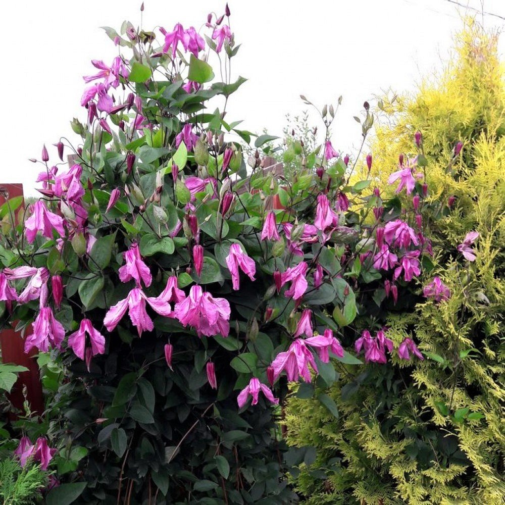 Клематис «Аленушка» — один из классических, проверенных временем сортов, который по-прежнему пользуется заслуженной популярностью у российских дачников. Этот декоративный многолетник ценится за неприхотливость, универсальность в озеленении и обильное цветение. Сорт был выведен в СССР в 1963 году селекционерами Никитского ботанического сада — А. Н. Волосенко-Валенис и М. А. Бескаравайной. Для создания «Аленушки» использовали клематис цельнолистный и сорт «Нежданный», что позволило получить растение с высокой декоративностью и устойчивостью. «Аленушка» — это многолетний полукустарник с лиановидными, но не цепляющимися побегами. Высота куста обычно составляет 1,5–2 метра. Побеги тонкие, вьющиеся, требуют опоры (шпалеры, арки, забор), но при отсутствии поддержки растение эффектно стелется по земле, выполняя роль почвопокровника. Листья сложные, цельные, насыщенно-зелёного цвета. Плюсы: - Универсальность: подходит для открытого грунта, контейнеров, балконов. - Декоративность и обильное цвет