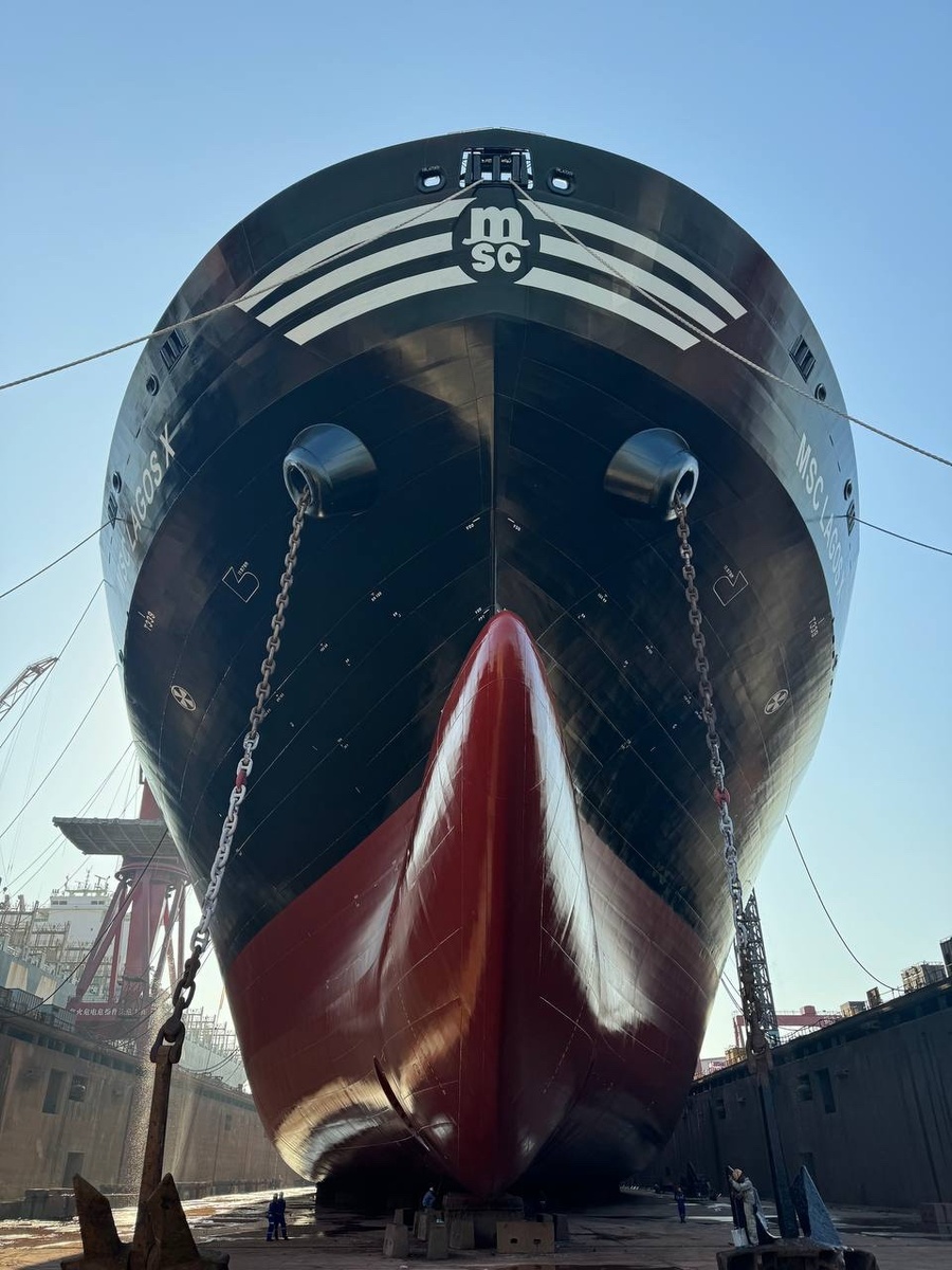MSC LAGOS X: для всех, кто связан с флотом MSC, и не только — действительно эксклюзивные кадры. Видеть контейнеровоз класса Neo Panamax в сухом доке с подводной частью, находящейся ниже ватерлинии, — редкая удача. Снимок сделан на завершающем этапе ремонтных работ, включающих покраску корпуса. Можно сказать, что контейнеровоз предстал во всей красе.
