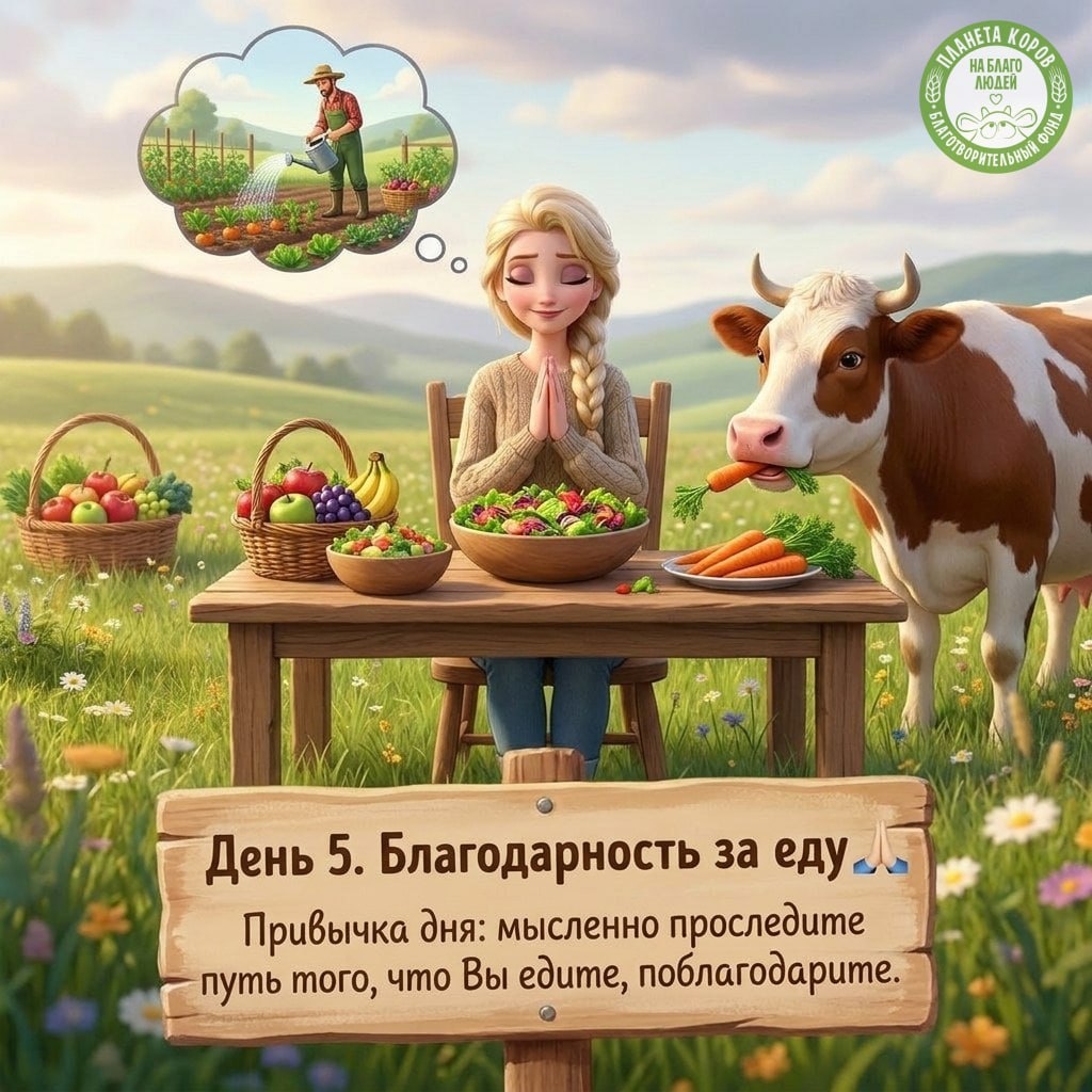 Марафон "Привычки от коров." День 5. Благодарность за еду 🐮 Корова всегда чувствует благодарность к людям, которые о ней заботятся. Вы можете так же — к тем, кто подарил Вам эту пищу. 🙏🏻 Привычка дня: перед одним приёмом пищи мысленно проследите путь того, что Вы едите. Например, гречка: 🌱 Сначала её вырастили в поле — кто-то поливал, удобрял, защищал от вредителей. Потом собрали комбайном. Отвезли на элеватор. Очистили. Упаковали в пакет. Погрузили в фуру. Водитель вёл её много километров. Продавец в магазине положил на полку. Вы выбрали, купили, принесли домой, сварили. 🙌🏻 Практика: просто поблагодарите мысленно всех, кто причастен к этому. Это очень сильно вдохновляет и наполняет нашу жизнь.