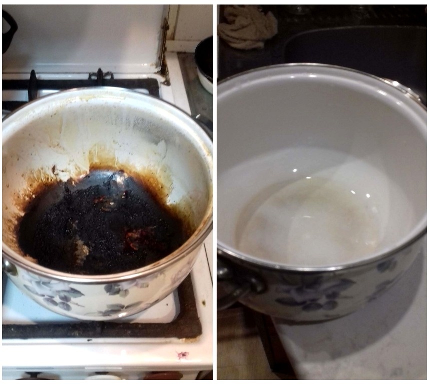 Вот такой казус случился у меня на днях. Поставила варить овощи (морковь и свеклу) на салатик. Прилегла я ненадолго, дома муж и дочь. И не заметила, как уснула. В общем, проснулась я от запаха дыма. А мои домочадцы сидят по разным комнатам и ничего не чувствуют! А на кухне моя любимая кастрюля превратилась… не знаю, во что она превратилась! Конечно, первым делом я залила кастрюлю водой и насыпала туда соли — ложки три. Накрыла крышкой и оставила на целый день и ночь. На следующий день слила воду и легонько жесткой губкой помыла все, что могло отмыться. НЕ СКОБЛИТЬ! Теперь оставляю свою пострадавшую кастрюлю просто сушиться. Лучше где-нибудь у батареи. Пусть хорошенько просохнет, лучше несколько часов. Ну, а сейчас аккуратненько счищаем гарь. Посмотрите, она сама отскакивает! Осталось почистить кастрюлю с любимым чистящим средством — и моя кастрюля как новая!