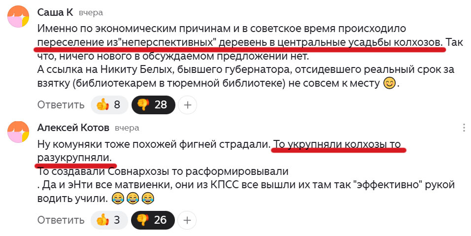 Продолжаю изумляться бесстыдству тех, кто поддерживает политику обезлюживания глубинки России ссылками на практику советской власти по укрупнению колхозов и ликвидации бесперспективных деревень, проводившуюся в 60-70-е годы прошлого века. По логике этих людей это одно и то же, что и нынешняя политика, приведшая к обезлюдиванию огромных территорий России. Я вообще не понимаю, как эти два совершенно разных процесса можно уравнивать? Ведь что происходило при укрупнении колхозов? Жители малых деревень в несколько дворов переезжали в центральную усадьбу колхоза или в более крупную деревню/село в пределах одного колхоза/района. На новом месте им или давали новое жилье, или помогали перевести старый дом вместе с остальным хозяйством (раскать дом по бревнам и собрать его на новом месте -- дело пары дней). При этом люди не теряли ни работы, ни связей с родственниками, а в плане доступа к благам цивилизации и социалке только приобретали. А что происходит сейчас? Людей сперва оставили без работы,
