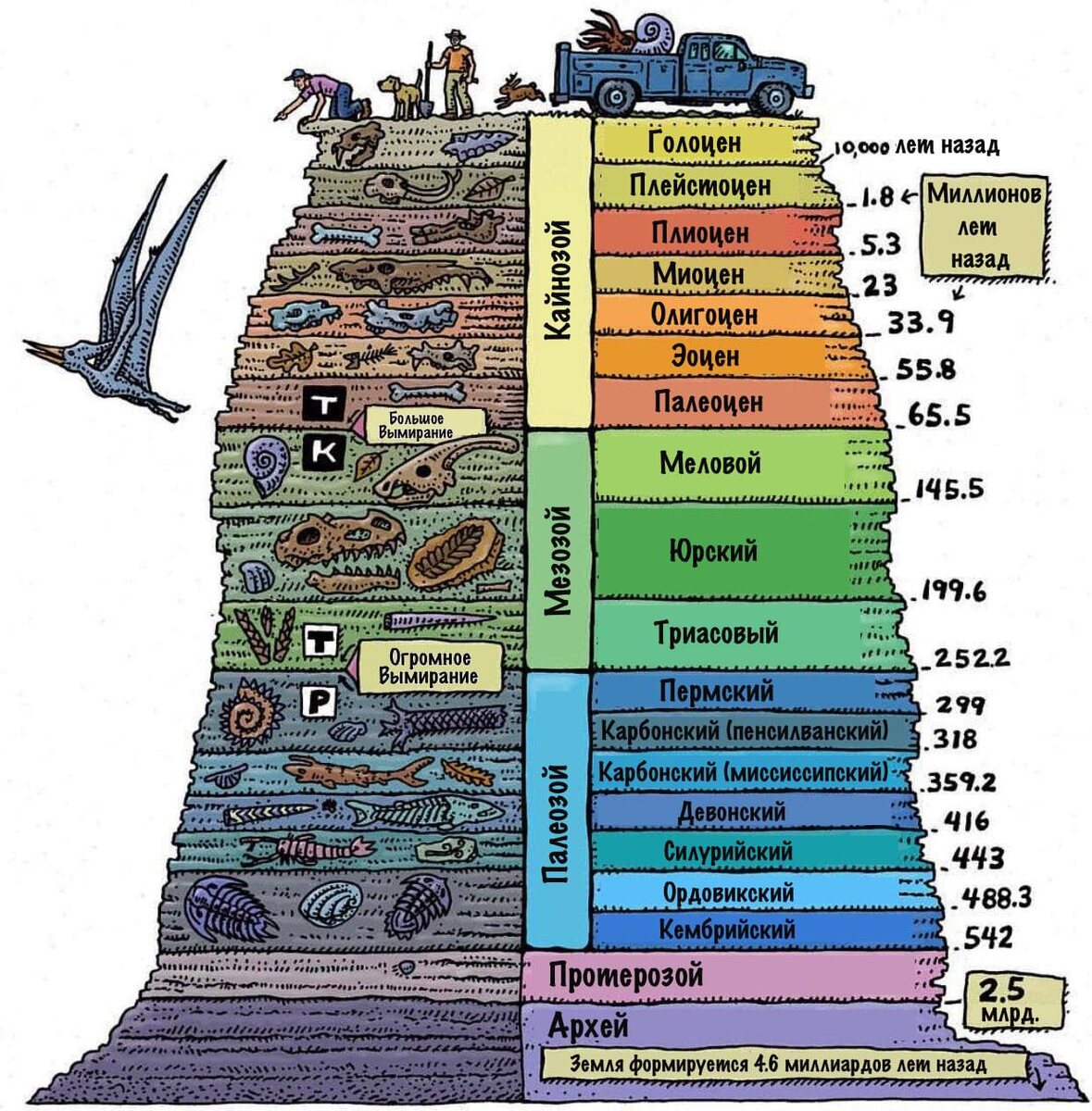 Архей - от греч архео = древний (см. и археоптерикс) Не путать с греч архи = главный Протерозой - от греч протерос + зой = старший/бывший + жизнь Палеозой - от греч палеос + зой = древний + жизнь 1) Кембрий - в честь римского наименования Уэльса - Cambria, на территории которого производились раскопки 2) Ордовик - в честь племени ордовиков, обитавших на территории Уэльса Период исследовал британец, и разрез с этой территории указал как типовой 3) Силур - назван в честь кельтского племени силуров, на землях обитания которого проводились геологические исследования, способствовавшие выделению данного периода 4) Девон - название дано по имени графства Девонши́р, или Девон, в юго-западной Англии, на территории которого распространены геологические породы этого периода 5) Карбон (каменноугольный период) - назван так из-за сильного углеобразования: в этот период процветали гигантские леса, а из-за отсутствия грибов и бактерий, способных быстро разлагать древесину, она накапливалась и