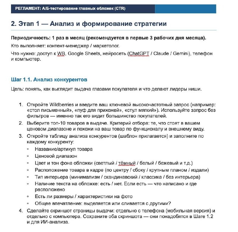 📈 Большинство селлеров на маркетплейсах совершают одну и ту же ошибку: меняют обложку, видят рост CTR и открывают шампанское. А через неделю замечают, что заказов стало меньше, а ДРР улетел в космос. Почему? Потому что они создали кликбейт. Люди кликают, но не покупают. Это не бизнес, это слив бюджета. Я упаковал всю нашу систему А/Б-тестирования в один Регламент и Таблицу, по которым у меня в холдинге работает даже сотрудник без опыта. 100 реакций поставили. Держите регламент - ЖМИ ТУТ. Теперь главное: как с ним работать, чтобы он не лёг в папку «потом». Регламент построен на одной аксиоме, которую я поставил в самое начало: рост CTR - хорошо только если CR не упал. Всё, что написано дальше - это система, которая не даёт вам потерять деньги на красивых, но бесполезных тестах. Четыре этапа. Проходить по порядку - это важно. Первый: анализ выдачи. Прежде чем делать новую обложку - смотришь на конкурентов и ищешь слепую зону. Что делают все - то и не трогаешь. Ищешь, чего нет. В