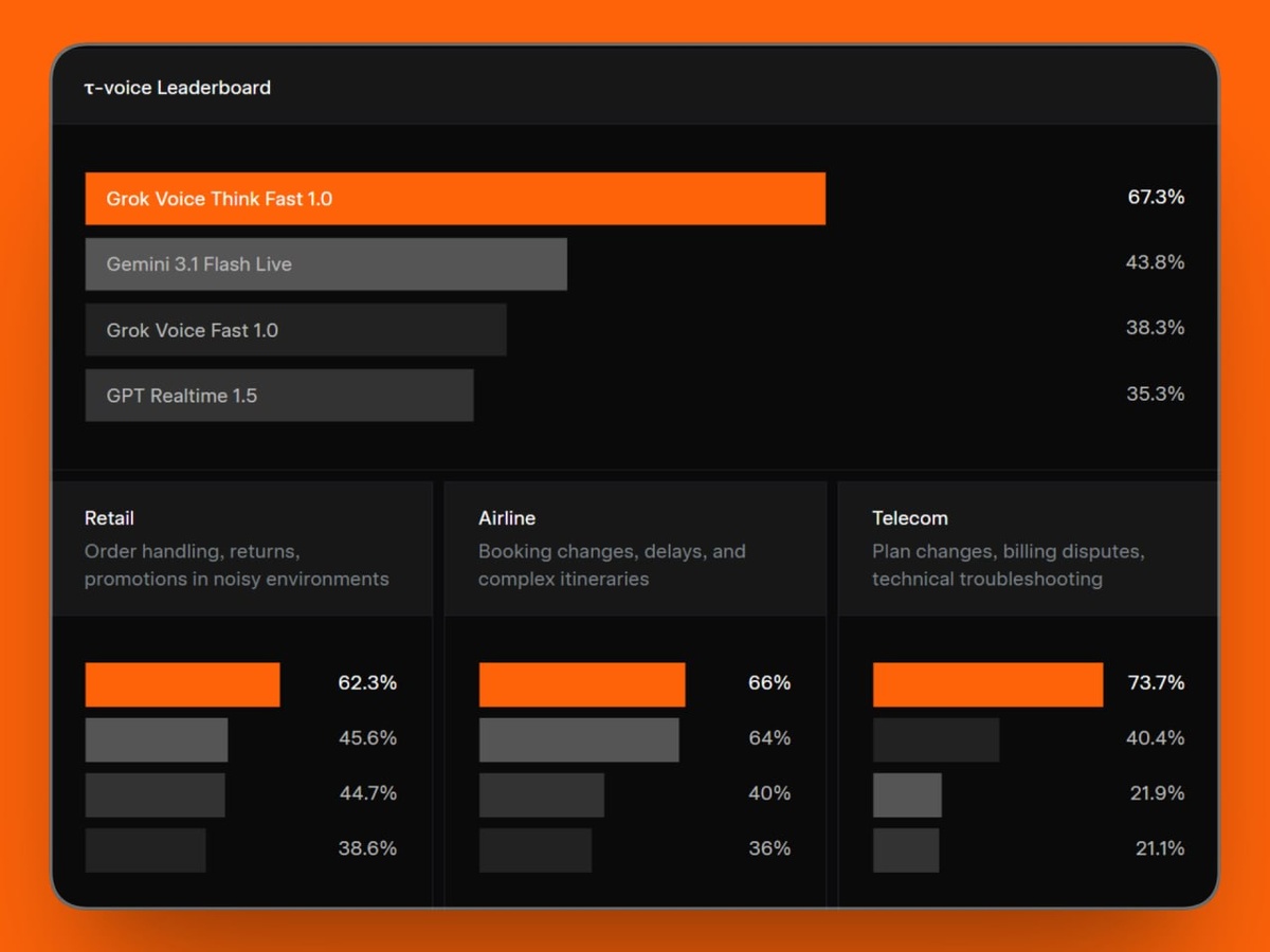 xAI представила Grok Voice Think Fast 1.0, голосовую модель, заточенную под сложные многоэтапные сценарии, где важны одновременно и быстрый ответ, и точность. Модель заняла первое место в Tau Voice Bench, одном из ключевых бенчмарков для голосовых систем. По словам разработчиков, она лучше любой другой модели на рынке справляется с реальными условиями разговора, фоновым шумом, акцентами и перебиваниями собеседника. Упор сделан не на синтез голоса, а на рабочие процессы из нескольких шагов. То есть модель рассчитана на сценарии, где ассистент не просто отвечает одной фразой, а ведёт диалог, уточняет детали и выполняет задачи параллельно. Детали Демо @bykorolev