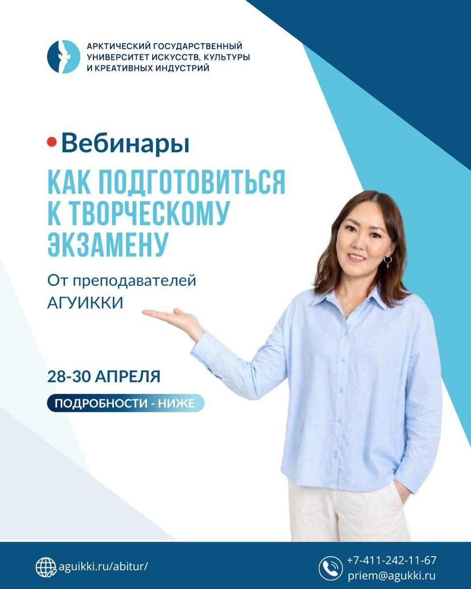 ! 🌟 📅 28 апреля – особенный день для всех, кто мечтает связать свою жизнь с искусством и культурой! 🎨 Вас ждут бесплатные онлайн-вебинары о творческих экзаменах: 🕑 14:00 – Кафедра народной художественной культуры и социально-культурной деятельности 👩🏫 Лекторы: • Бурцева Роза Христофоровна – доцент кафедры, член Союза Хореографов России • Сидорова Анатасия Марковна – старший преподаватель кафедры, член Союза Хореографов России • Саввина Сардана Реворьевна – доцент кафедры, кинопродюсер, Отличник культуры РС (Я) 🔗 Присоединиться к вебинару 🕑 16:00 – Кафедра музыкального искусства 👩🏫 Лектор: • Алла Витальевна Бузмакова – старший преподаватель кафедры, член Союза театральных деятелей РФ 🔗 Присоединиться к вебинару ✨ Не упустите возможность узнать больше о наших специальностях, задать вопросы преподавателям и сделать первый шаг к своей мечте! 🔗Полное расписание вебинаров - на сайте. #АГУИККИ #Абитуриенту