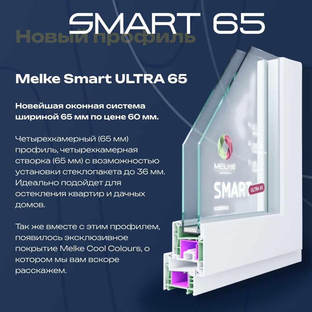 Ищете «золотую середину»? Когда базовых окон уже мало, а премиум-системы не вписываются в бюджет, на сцену выходит Melke Smart Ultra 65. Это обновленная система, которая ломает стереотипы о том, каким должно быть современное окно. Почему стоит выбрать Smart Ultra 65? 🔹 Уникальный размер 65 мм: Большинство окон на рынке имеют ширину 60 или 70 мм. Smart Ultra — это 65 мм и 4 воздушные камеры. Она значительно теплее «базовых» систем, но по цене остается максимально доступной. 🔹 Технология CO-EX: Забота об экологии и прочности. Внутри — жесткий рециклинговый слой, снаружи — идеально белый глянцевый пластик высшего качества. 🔹 Тишина и комфорт: Ширина профиля позволяет установить более толстый стеклопакет, что в сочетании с 4 камерами отлично отсекает городской шум. Идеально подходит для: ✅ Квартир и частных домов: где хочется больше естественного света и тепла. ✅ Замены старых окон: когда нужно надежное решение на 20-30 лет без переплаты за «избыточный» пластик. ✅ Ценителей дизайна: