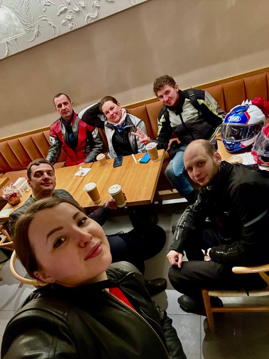Обратно рванули по Новорижскому шоссе — в меру динамично, без остановок. В Москве собрались за ужином в тёплой компании и сделали первую «шлемофотку» этого сезона! 📸
