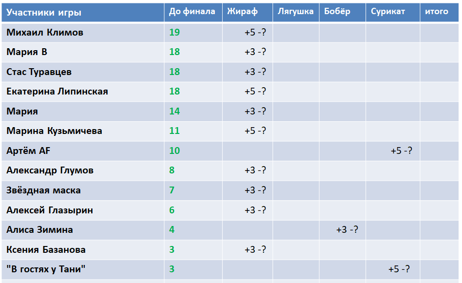 Зелёным цветом - достижения игроков по результатам всех дней. Чёрным под вопросом - это их предположения на победителя шоу.