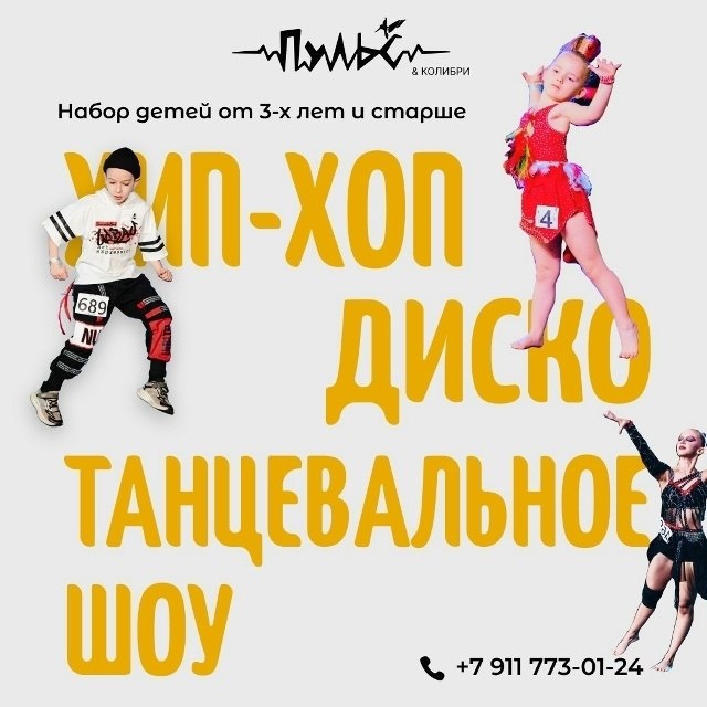 😊 ✔️Множество танцевальных направлений от хип-хоп и диско до сценических направлений. ✔️Профессиональные преподаватели , которые делятся своим опытом и любовью к танцу. ✔️Участие в концертах и соревнованиях различного уровня. ✔️Группы детей (3+ и старше) и взрослых (18+ и старше), разных уровней подготовки и возможность индивидуальных занятий Наш адрес: - пгт Сиверский, ул. Строителей, 1 ☝️Для получения дополнительной информации обращайтесь по телефону 89117730124. Подробнее о нас в нашей официальной группе vk.com/pulse_colibri_dance Источник: Открыть
