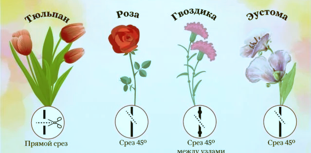 — по возможности подрезайте под водой Косой срез увеличивает площадь впитывания воды и не даёт стеблю плотно упереться в дно вазы. Для разных цветов есть нюансы. У роз и сирени стебли плотные — их можно слегка расщепить снизу. У тюльпанов и нарциссов стебли мягкие, поэтому лучше делать аккуратный ровный срез без сильного давления. У гербер стебель хрупкий, его важно не сдавливать. Повторять подрезку лучше каждые 1–2 дня при смене воды. Это помогает цветам дольше ос