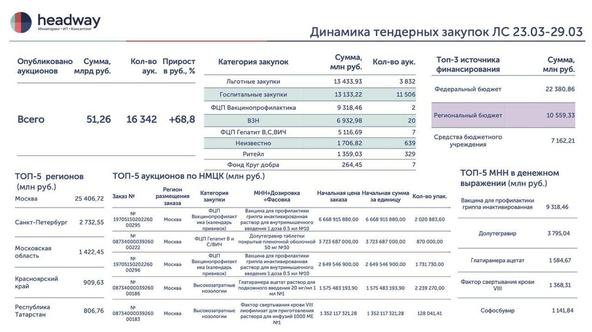 Делимся краткой инфографикой тендерных закупок за период 23.03–29.03 (в сравнении с 16.03–22.03) 📆 📈 Общая динамика Объём опубликованных аукционов резко вырос: 30,37 млрд руб. → 51,26 млрд руб. (+68,8%, +20,9 млрд руб.). Количество аукционов также увеличилось: 15 365 → 16 342 (+977). 👉 Рынок восстановился после падения за счёт возвращения крупных федеральных закупок. 💊 Категории закупок 😷 Льготные закупки - крупнейший сегмент: 13,43 млрд руб. 🏥 Госпитальные закупки - 13,13 млрд руб. 💉Вакцинопрофилактика - 9,13 млрд руб. 🧬ВЗН - 6,93 млрд руб. 💊ФЦП (гепатит В, С/ВИЧ) — 5,12 млрд руб. 👉 Рынок снова сместился в сторону крупных госпрограмм и централизованных закупок вакцин от гриппа. 💰 Источники финансирования 🇷🇺 Федеральный бюджет - 22,38 млрд руб. 🏛 Региональный бюджет - 10,56 млрд руб. 🏥 Средства бюджетных учреждений - 7,16 млрд руб. 👉 Основной драйвер роста федеральное финансирование, доля которого резко увеличилась. 📍 Регионы Лидер - Москва (25,41 млрд руб.) 🚀