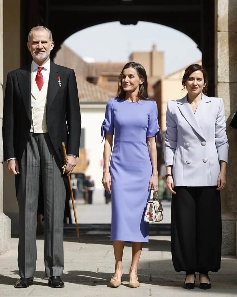 В Алькала-де-Энарес, в университете, где стены помнят лекции Лопе де Веги, королева Летиция вручила премию Сервантеса мексиканскому писателю Гонсало Селорио. Высшую литературную награду испаноязычного мира. И оделась соответственно: точно, продуманно, без единой лишней детали. На Летиции было платье миди Carolina Herrera цвета василька с рукавами на завязках, модель Delphinium. Название говорит само за себя: дельфиниум, садовый цветок с оттенками синего и фиолетового, переменчивый в зависимости от освещения. Именно это и происходит с цветом платья: в репортажных фото оно читается то как васильковый, то уходит в сиреневую сторону. Силуэт строгий, миди, никакой избыточности. Завязки на рукавах добавляют романтическую ноту, не разрушая архитектуры. К платью Летиция взяла цветочную сумку Furla ‘1927 Mini’. Маленький акцент с большим характером: флоральный принт на фоне монохромного образа работает как подпись художника. Бежевые туфли Magrit Carlota держат образ. А танзанитовые серьги Gold&