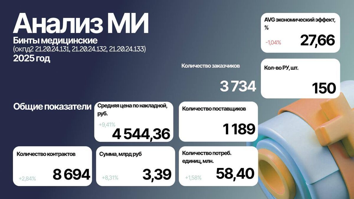 Мы выделили 4 наименования для анализа: 1. Бинты медицинские 2. Бинты марлевые медицинские 3. Бинты эластичные медицинские 4. Бинты гипсовые медицинские 📊 Ключевые цифры за 2025 год: 🔴8 694 контракта (+2,84%) 🔴3,39 млрд ₽ (+8,31%) 🔴58,4 млн единиц потребления 🔴3 734 заказчика / 1 189 поставщиков 🔴экономия на торгах: 27,66% (-1,04%) По рынку видна классическая инфляционная модель роста: объём денег растёт быстрее, чем количество контрактов → рынок увеличивается в первую очередь за счёт цены, а не расширения потребления. 1️⃣Ярко выраженное региональное 🗺️распределение закупок. Около 87% объёма приходится на субъекты РФ, что говорит о высоком спросе расходных медицинских материалов по всей стране. 2️⃣Больницы 🏥формируют львиную долю закупок (более 2,3 млрд ₽). 3️⃣География 📍 с центрами влияния Москва, Санкт-Петербург и Краснодар, но регионы также дают значимый вклад. 4️⃣Практически нулевая импортная зависимость 🇷🇺 Импорт - всего 372 контракта (151,12 млн ₽) против 8 453 (