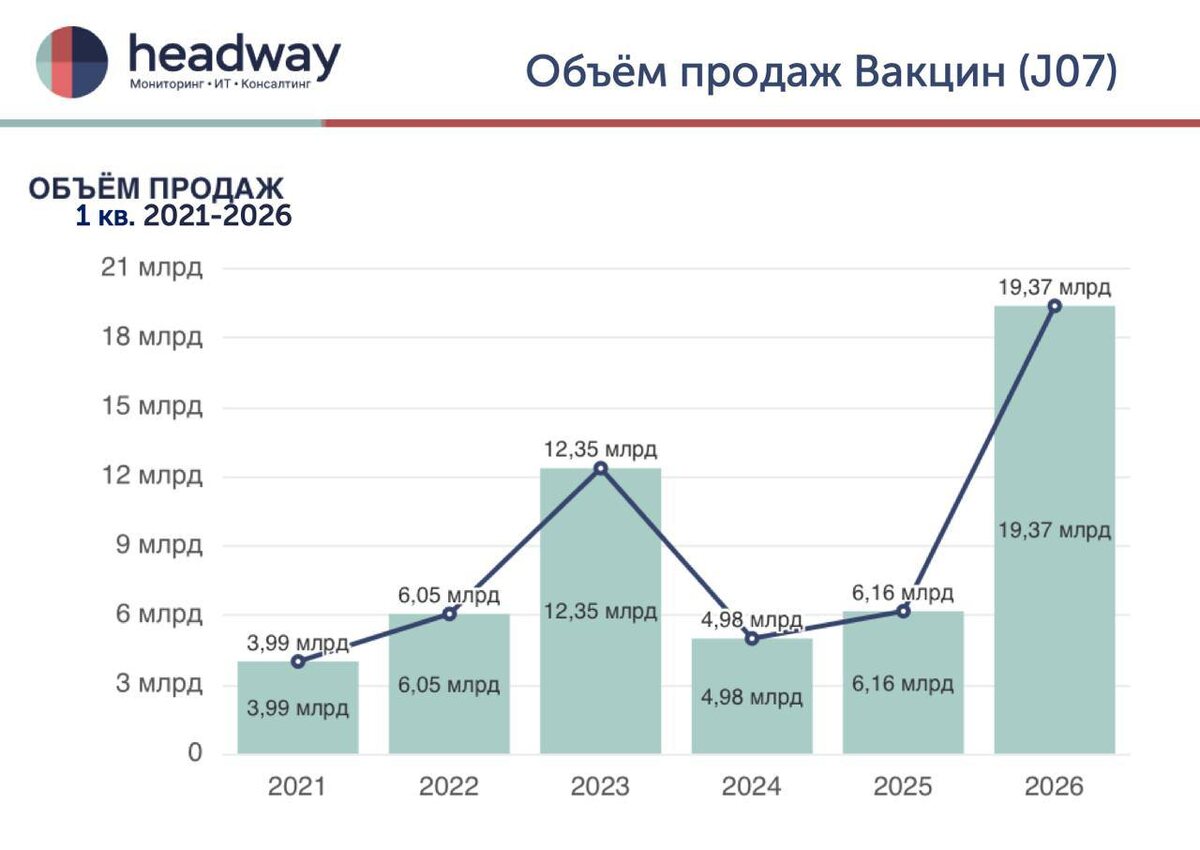 📈 Объём продаж: 🔴1 кв. 2025: 6,16 млрд 🔴1 кв. 2026: 19,37 млрд рост в 3,1 раза или +214%. Существенный рост произошел благодаря закупке Ультрикс Квадри в конце 1 квартала на сумму 6,67 млрд руб. А также в пятёрку лидеров входят: 🔴Совигрипп - 2,68 млрд руб. 🔴Вактривир - 2,31 млрд руб. 🔴Адс-М-анатоксин - 1,35 млрд руб. 🔴Превенар 13 - 817,42 млн руб. Тройка поставщиков 🚚, ожидаемо, выглядит следующим образом: 🏆НАЦИМБИО - 14,29 млрд руб., доля 74% 🥈Эпидбиомед-Импэкс - 913,46 млн руб., доля 5% 🥉Биоритм - 657,95 млн руб., доля 3% 📊Видно, что рынок вакцин сейчас драйвится государственными закупками и сезонными кампаниями. При этом вокруг вакцинации есть немало интересных наблюдений и нюансов, о которых не всегда задумываются в повседневной практике. Некоторые из них до сих пор обсуждаются и изучаются🩺 ❓Как думаете, какой фактор может влиять на силу иммунного ответа после вакцинации? #АналитикаHWC #Вакцины