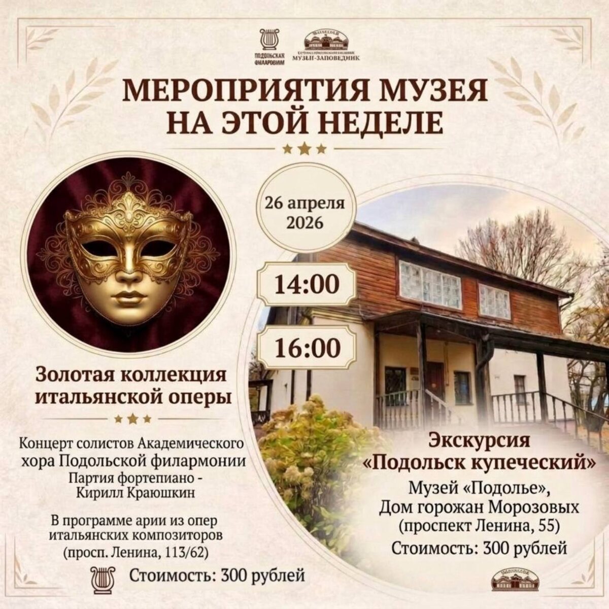 ✨ Мероприятия 26 апреля от музея "Подолье" 🎭 в 16:00 в Подольском выставочном зале — концерт «Золотая коллекция итальянской оперы». Шедевры Джузеппе Верди и Джакомо Пуччини. На сцене — солисты Подольской филармонии. 🎟 Билеты уже в кассе выставочного зала. 🏛 А 26 апреля в 14:00 вас ожидает погружение в историю: Экскурсия «Подольск купеческий», Дом горожан Морозовых Приглашаем вас познакомиться с купеческими династиями, которые внесли весомый вклад в развитие города. 📞 Запись по телефону: 8 (496) 69-92-39 📌 Проспект Ленина, д. 45 📆 26.04.2026 🏢 Музей-заповедник «Подолье» - Дом Морозовых 📍 г. Подольск, пр-т Ленина, д.55 💰 Цена: 300 ₽ ⭐Поддержать канал голосом 🍰Где поесть в Подольске ✅ Мероприятия Подольск https://dzen.ru/id/66ed500f7b5671493eca3fd6 https://vk.ru/podolsk_events http://dzen.ru/podolsk_events