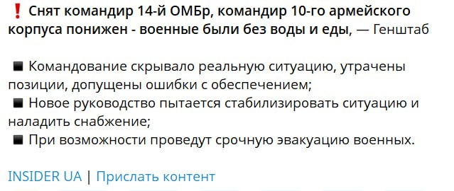 км". Причин у подобной бравады много: поднятие боевого духа, привлечение внимания мирового сообщества, выравнивание рейтинга руководства страны, но точно не успех ВСУ на ЛБС. Однако громкие заявления разбиваются о суровую действительность: обстановкой Генштаб ВСУ не владеет, и происходит это из-за методичного обмана со стороны командиров уровня соединений. В 14-й омбр ВСУ комбрига Лисецкого сняли с должности за провалы на направлении и сокрытие реальной обстановки. Также понижен в должности командующий 10 АК, действующего на том же направлении. Случай не первый — ранее за ложь были отстранены командиры 54 омбр, 10 огшбр, 11 АК. Паттерн давно закрепился: наверх сообщаются красивые данные, на основе которых Генштаб составляет умопомрачительные отчеты. Работает это ровно до тех пор, пока разрыв между реальностью и ситуацией "на земле" не станет критическим. Стоит отметить, что для обычных бойцов последствия методичного обмана вышестоящего начальства гораздо более существенны, чем для ге