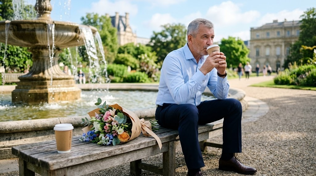 Он пришёл в одно утро к той самой кофейне. Купил два стакана и букет. Сел на скамейку у фонтана. И впервые за год с лишним сделал то, чего не делал ни разу.