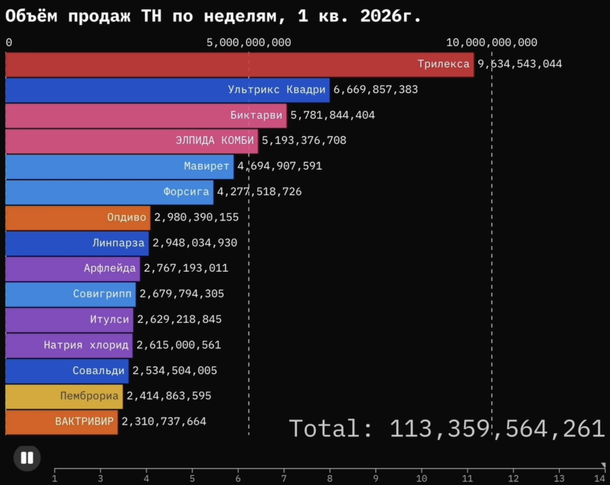 Трилекса лидирует по предварительным итогам 1 кв.2026г. Еще пару дней назад вторую строчку занимал ТН Биктарви, а замыкал тройку лидеров ТН Элпида Комби. Однако 31.03 был опубликован контракт на поставку вакцины от гриппа Ультрикс Квадри на сумму 6,67 млрд руб. (дата начала поставки с 1.06.2026, окончание поставки до 9.11.2027 гг.) и таким образом по объёму продаж поднялся на второе место. Будем ожидать итоговый рейтинг ТН по мере публикации контрактов в нашем квартальном обзоре. Не пропустите 😉 Подписывайтесь на наши каналы: Telegram 👀Max 👀Дзен