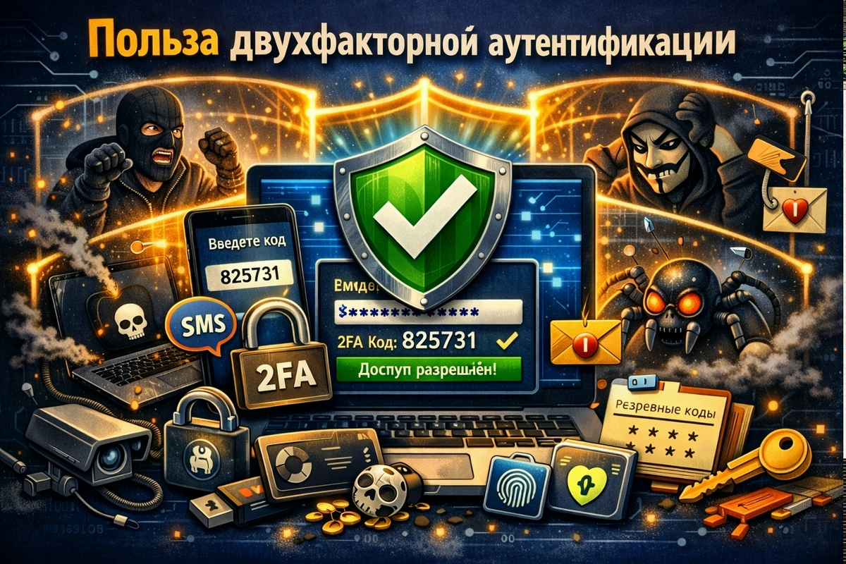 Двухфакторная аутентификация — это дополнительный уровень защиты, который требует подтверждения личности по двум каналам: пароль (первый фактор) и, например, код из приложения (второй фактор) . Даже если злоумышленники украли ваш пароль — через фишинг, утечку базы данных или просто подсмотрели через плечо — без второго фактора они ничего не смогут сделать.