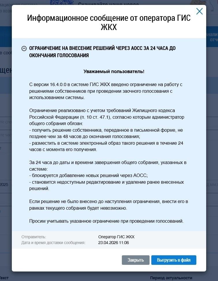 В ГИС ЖКХ отключили возможность внесения решений собственников в систему за 24 часа до окончания общего собрания, что соответствует п. 10 ст. 47.1 ЖК РФ (администратор ОСС обязан получить решение собственника, переданное в письменной форме, не позднее чем за 48 часов до окончания голосования и разместить в системе электронный образ такого решения в течение 24 часов с момента его получения).