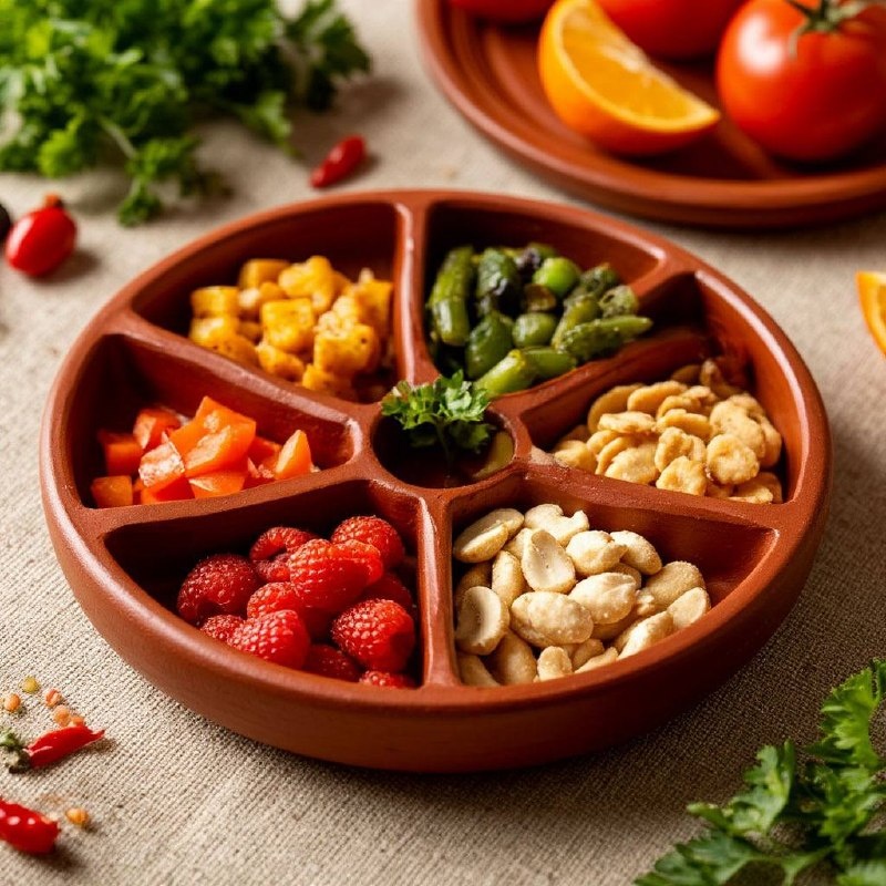Тарелка с несколькими отделениями, которая позволяет разделить разные виды закусок (оливки, орешки, соусы) или подать ассорти из сыров и фруктов.