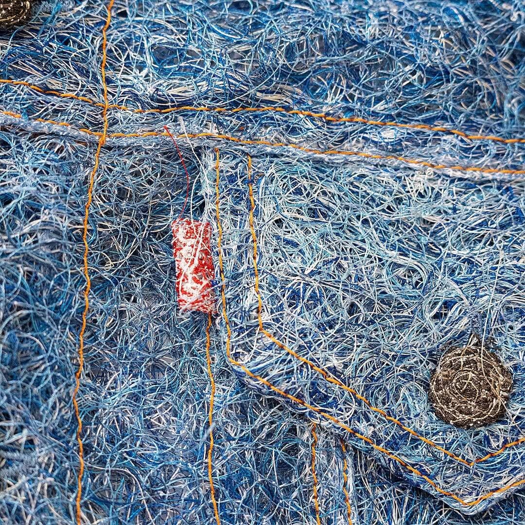 Токийский художник Юки Сугано сделал её полностью из вышивки — только нити, без ткани. Выглядит как классический деним, но на самом деле это кропотливая ручная работа.