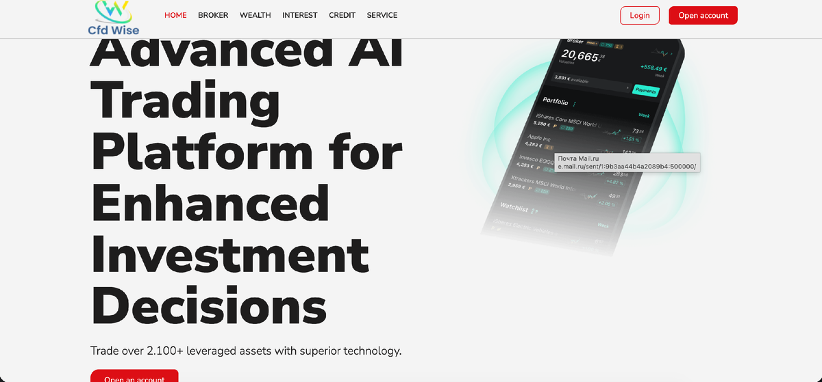 ⚠ Внимание: платформа Webtrader.cfdwise.com, связанная с доменом Cfdwise.com, позиционируется как брокерский сервис для торговли CFD и инвестиций. Однако ряд признаков указывает на высокий риск и возможную мошенническую схему. Если вы ищете: — ниже подробный анализ. На сайте заявляют: ✔ доступ к CFD-торговле