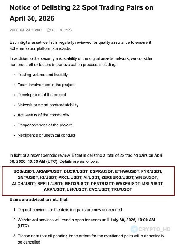 ‼️ Массовый делистинг токенов на бирже Bitget! – объявление