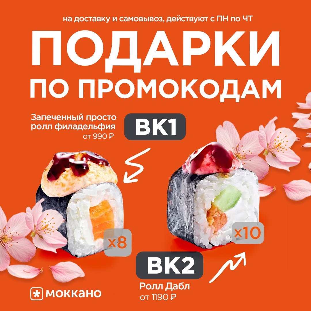 🥘 Просто промокоды на подарки❤️ Промокод: ВК1 - Запеченный просто ролл филадельфия от 990 рублей. Промокод: ВК2 - Ролл Дабл от 1190 рублей. Действуют с ПН по ЧТ 1 применение 1 промокода на пользователя Действуют до 29 апреля Не суммируется с другими акциями, кроме самовывоза 📶 Категория: Ресторан 🏢 Суши-бар Моканно 📍 г. Чехов, ул. Земская, д. 14 ⏱ Часы работы: 11:00 — 23:00 ⭐Разместить публикацию ⭐Поддержать голосом ✅ Где поесть, Чехов!? https://dzen.ru/id/670a701b353dbb6d0fb04a97 http://vk.com/gdepoestchekhov http://dzen.ru/gdepoestchekhov