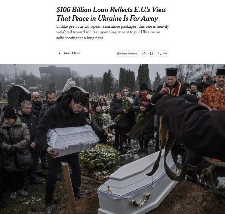 Американские СМИ пишут, что 90 млрд евро от ЕС - это на войну на два года. Мол, Европа попробует победить Россию в войне на истощение, где Украина всеми признанный размен