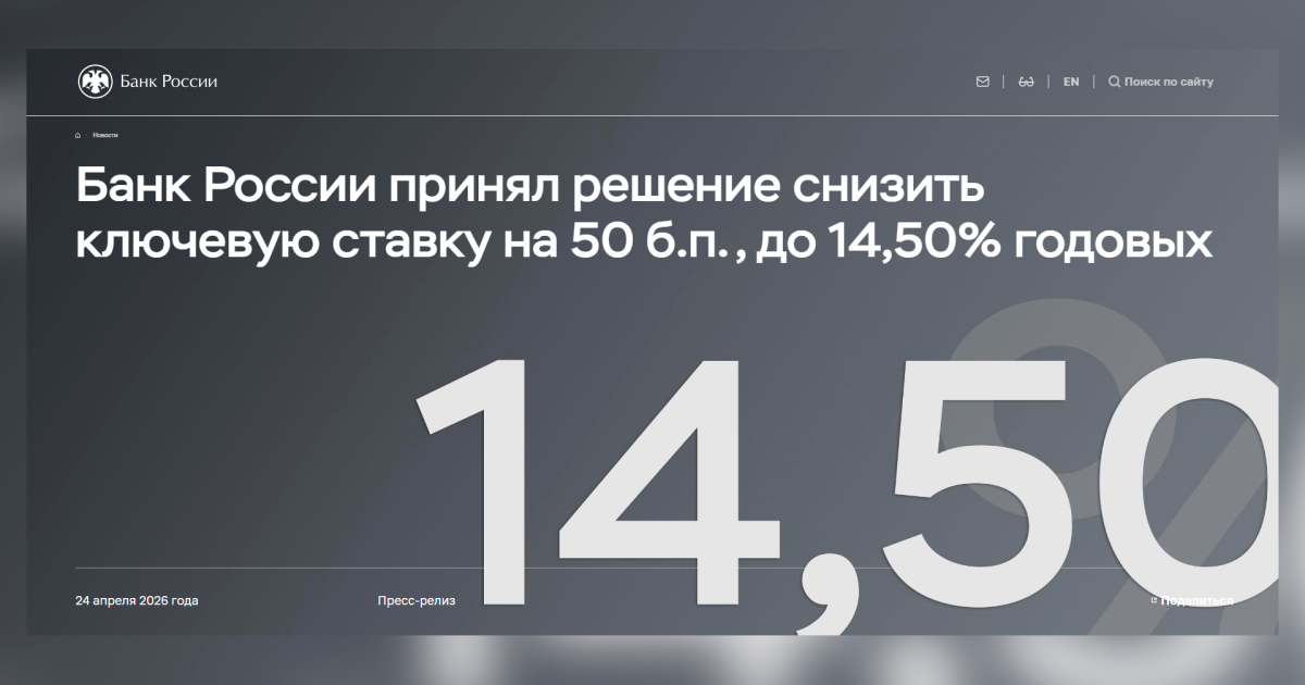 Банк России снизил ключевую ставку на 50 базисных пунктов. Об этом сообщается на сайте регулятора. В заявлении сказано, что поводом для такого шага стало выравнивание спроса и предложения на внутреннем рынке. Публикуем главные тезисы из доклада регулятора. Уточняется, что средняя ставка в 2026 году ожидается на уровне 14-14,5%, а в 2027 году она снизится до 8-10%. Общий рост цен по итогам текущего года составит 4,5-5,5%, а целевая отметка в 4% будет достигнута в последние 6 месяцев 2026 года. Регулятор отметил, что кадровый голод на предприятиях постепенно спадает – дефицит работников достиг минимума с 2023 года. На этом фоне компании намерены проводить более скромные индексации зарплат. При этом банковские условия остаются строгими, поэтому кредитная активность граждан и бизнеса сдержанна. Население по-прежнему предпочитает направлять свободные средства в накопления. Напомним, что 20 марта Банк России опустил ключевую ставку с 15,5% до 15%.