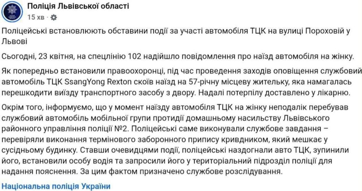 Наряд полиции оказался свидетелем, как во Львове автомобиль ТЦК сбил женщину, и сразу же его задержал, сообщает полиция