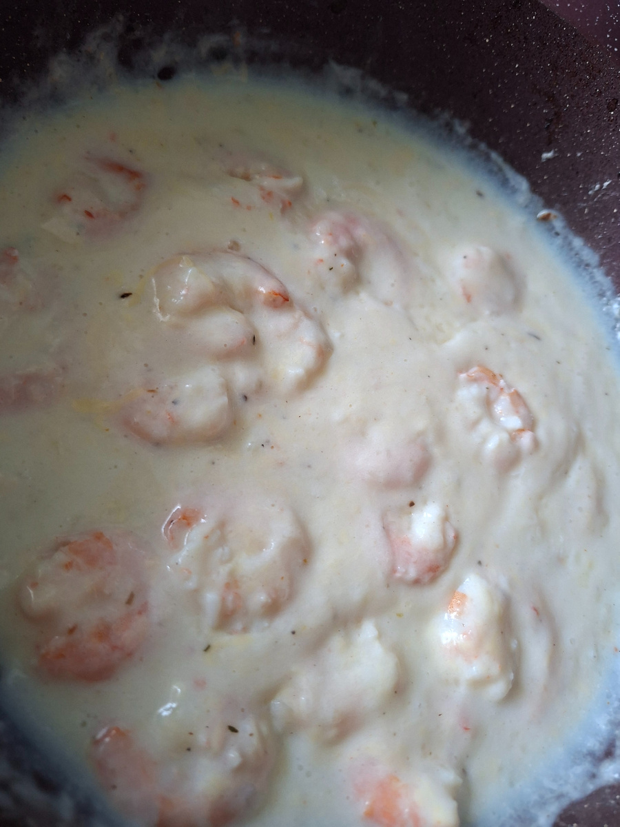 Чтобы не передержать креветки как вариант их шумовкой достать из соуса, а потом вернуть обратно.