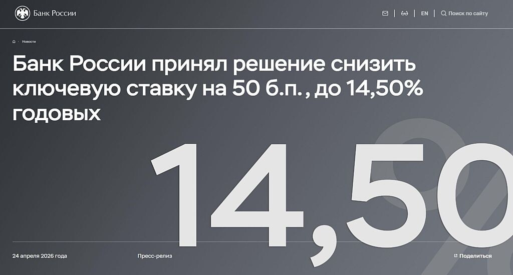п. — до 14,50% годовых 24 апреля 2026 года Совет директоров Банка России принял решение о снижении ключевой ставки на 50 б.п. — до 14,50% годовых. Напомним, что цикл смягчения денежно-кредитной политики начался в июне 2025 года. «Базовый сценарий предполагает среднюю ключевую ставку в диапазоне 14,0–14,5% годовых в 2026 году и 8,0–10,0% годовых в 2027 году. По прогнозу Банка России, с учетом проводимой денежно-кредитной политики годовая инфляция снизится до 4,5–5,5% в 2026 году. Устойчивая инфляция сложится вблизи 4% во втором полугодии 2026 года. В 2027 году и далее годовая инфляция будет находиться на цели. Инфляционные ожидания с марта менялись разнонаправленно. Инфляционные ожидания населения снизились. Ценовые ожидания бизнеса существенно не изменились. Ожидания участников финансового рынка немного выросли. В целом ожидания будущей инфляции сохраняются на повышенном уровне. Это может препятствовать ее устойчивому замедлению. По оперативным данным, российская экономика в 1к26 з