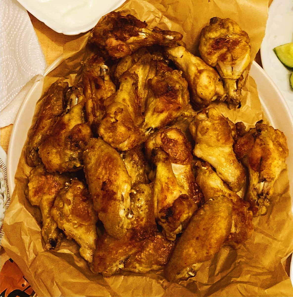 Берём крылья (я обычно 10-12 беру), делим на фаланги (третью не беру), моем и промакиваем бумажным полотенцем до суха. Это важный пункт, крылья должны быть максимально сухие.
