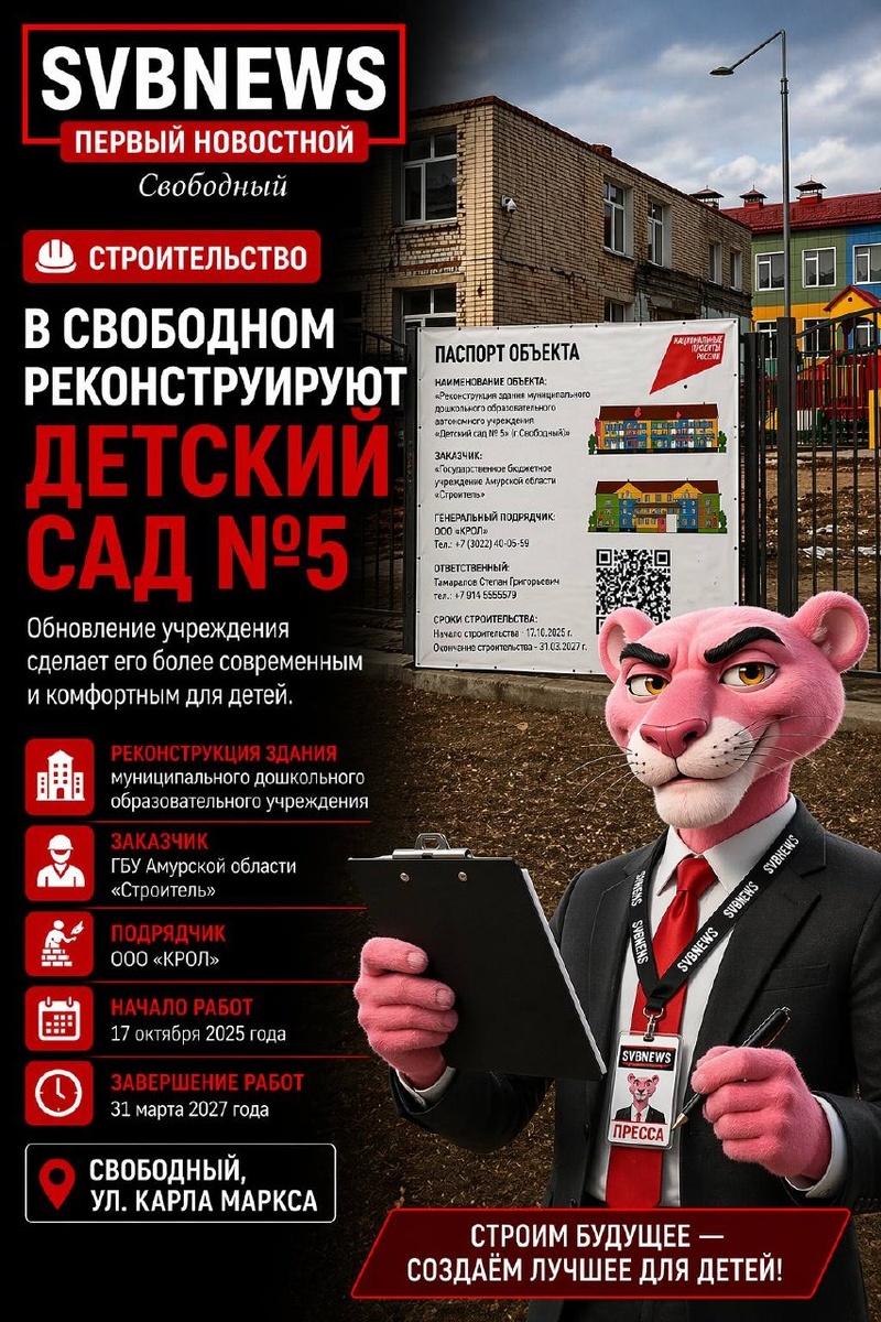 На территории объекта размещён паспорт строительства, согласно которому работы проходят в рамках обновления муниципального дошкольного учреждения. Заказчиком выступает государственное бюджетное учреждение Амурской области «Строитель», генеральный подрядчик — ООО «КРОЛ». Согласно информации на объекте, строительство стартовало 17 октября 2025 года, а завершение работ запланировано на 31 марта 2027 года. После реконструкции детский сад должен получить обновлённое здание и современную инфраструктуру для комфортного пребывания детей. ПОДПИСЫВАЙТЕСЬ НА НАС В ПРОЧИХ СОЦИАЛЬНЫХ СЕТЯХ ЧТОБЫ НЕ ПОТЕРЯТЬСЯ 📱 МАХ 📱 ВК 📱 Telegram 📱 Оk