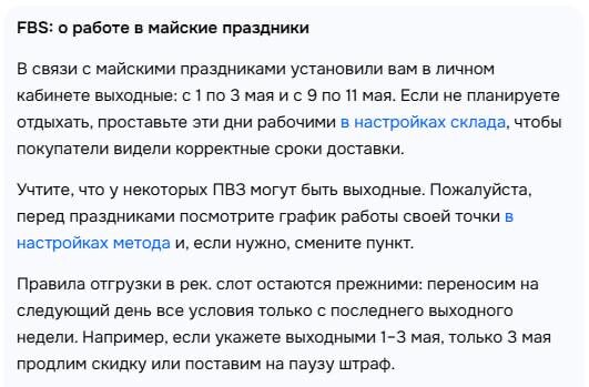 Платить — всё равно придется Ozon объявил «выходные» на майские: с 1 по 3 и с 9 по 11 мая. Звучит как можно спокойно не работать. Но если вы на FBS — там другая логика. Бесплатно перенести отгрузку можно только на последний выходной день. Все остальные дни — уже платно. То есть формально выходные есть. По факту — отдых превращается в платную опцию. Хочешь не отгружать несколько дней подряд — готовься доплатить. Не хочешь платить — работай в праздники. Неплохая конструкция получилась. Если у вас плохо прогружаются файлы, все посты также доступны в MAX